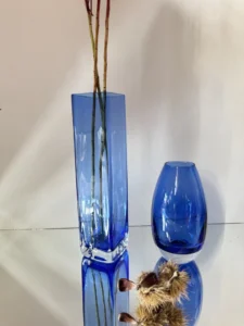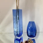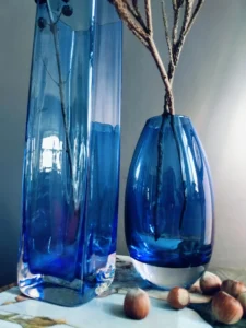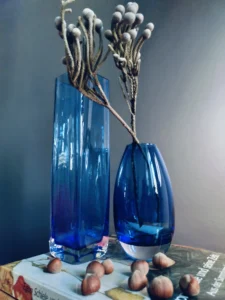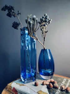 Podniebny blask to wyjątkowy duet wazonów z ręcznie formowanego szkła artystycznego w intensywnie kobaltowym kolorze. Zestaw łączy minimalistyczną formę z głębią barwy i ponadczasowym designem, który odnajdzie się w nowoczesnym apartamencie, klasycznym salonie i wnętrzu w stylu japandi. Obie formy doskonale się uzupełniają — smukły sześciokątny wazon nadaje pionową elegancję, natomiast owalna forma z zaokrąglonym dnem wprowadza wizualną miękkość i harmonię.