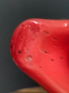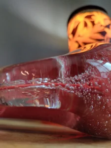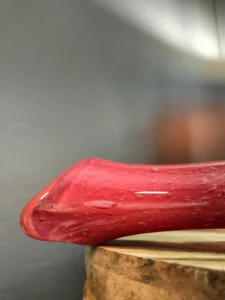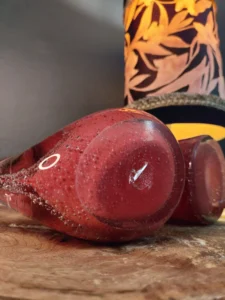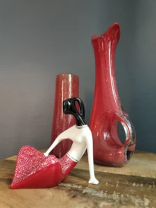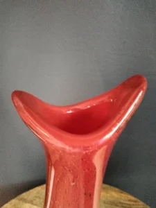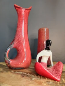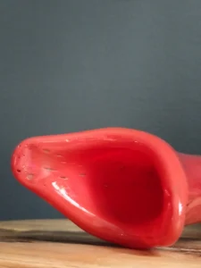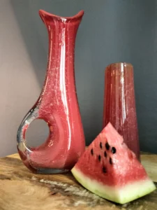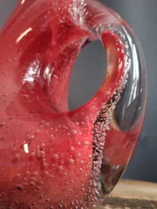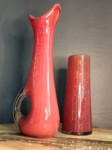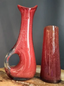 „Raspberry-ice unique”. – A unique set of handmade inflatable vases, with air bubbles. Vases with a unique and unobvious color of extinguished coral red. Larger, with a’ la ear handle and the so-called „ear”. The bow was built in the 1970s/80s. At the Wolomin Glassworks in Wolomin. It is likely to be the form of Tadeusz Szymanski. Made of multicolored glass, inside coral red, outside colorless with lots of air bubbles. Very impressive, perfect in form and unprecedented color. On the bottom with a visible so-called. rving (lens). A cone vase, also in an unobvious color of extinguished red, probably from the end of the last century, from Tarnów’s Fistek Glass Artistic and Economic Glassworks. A set for both collectors and connoisseurs, as well as for those who fall in love with the unique form and appreciate the applied art of Polish artists of the last century. Very good condition. Vase cone: height – 22,5 cm, base diameter – 9 cm, inlet diameter – 6,5 cm Vase with hole: height – 34,5 cm, width at widest point – 13 cm, base diameter 13 c. inlet- 6 cm wide , 10 cm span.