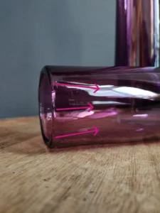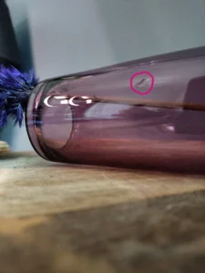 Widoczne ślady użytkowania i produkcji – m.in. drobne bąbelki, zarysowania i wtopione pęcherzyki powietrza. Na jednym z egzemplarzy zaznaczone mikropęknięcie (widoczne na zdjęciu). Każdy ślad to część opowieści tych obiektów.