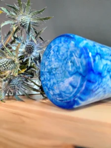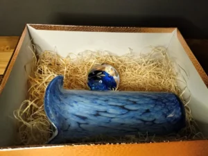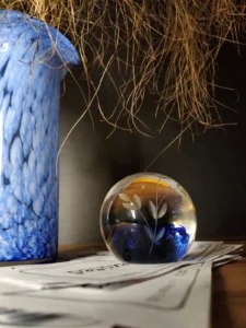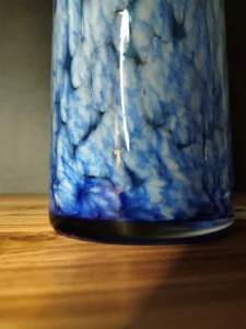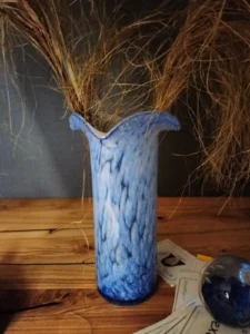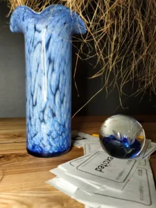 The „Spherical Wave” – includes a magic bullet vintage paper button and an original vase with a decorative end – a valance (wave). Paper button, glass inside decorative shapes in cobalt color, with air bubbles that give the design lightness. An ornate branch-shaped cut motif adds a touch of class. Comes with a vase probably from the 1970s of hand-formed glass in cobalt and white. Spotted technique elements with white glass flecks. The set is united by the color element and the fact that the items were decorative, as well as serving a useful function, for the past several decades.