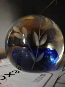 Glass sphere: Height: 7 cm, base: 5 cm, circumference: 25 cm.