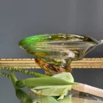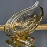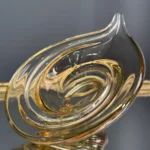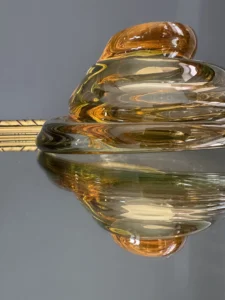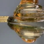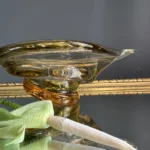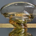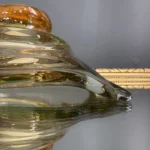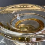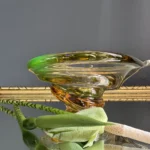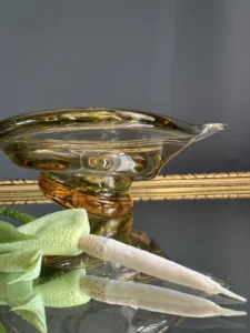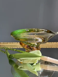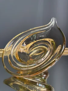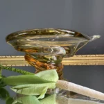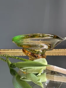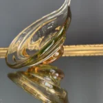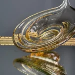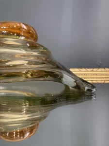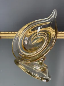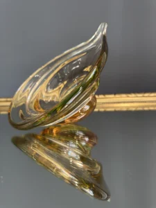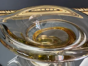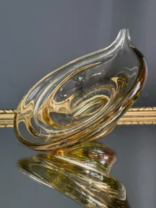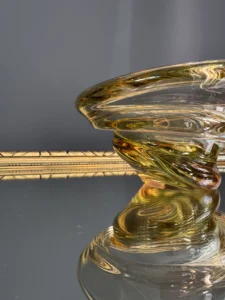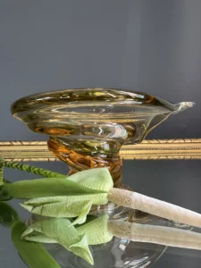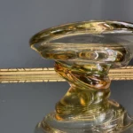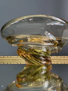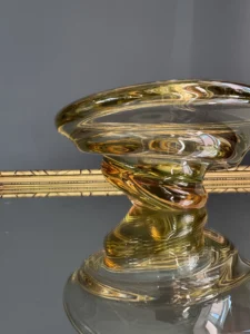 Bursztynowo-złota misa artystyczna z lat 60. to wyjątkowy przykład mistrzowskiego rzemiosła szklarskiego. Jej transparentna, świetlista struktura i zjawiskowy spiralny układ szkła przyciągają uwagę niczym rzeźba użytkowa.
