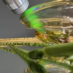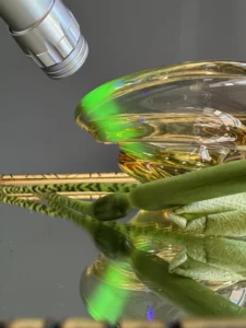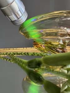 Dodatkowy atrybut, który czyni ją wyjątkową, to dodatek uranu, który pięknie świeci na zielono przy podświetleniu światłem UV – próbka tego niezwykłego efektu widoczna na zdjęciach, gdzie widoczny jest zielony kolor po podświetleniu latarką.