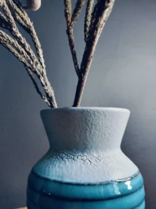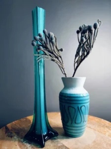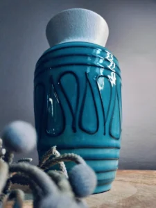 Wazon ceramiczny West Germany (sygnowany numerem 663-18) – w stylu fat lava, o matowej białej górze i cieniowanej turkusowo-morskiej dolnej partii z wypukłą dekoracją. Idealnie kontrastuje z błyskiem szkła.