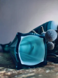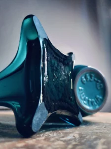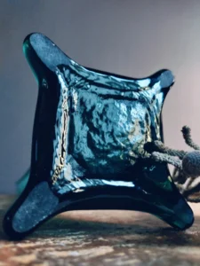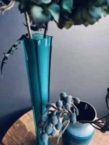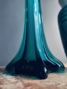 Wazon szklany art glass – smukła forma na czterech geometrycznych „łapkach”, wykonana z grubego szkła w odcieniach morskiego błękitu i głębokiego grafitu. Zachwyca lekkością kształtu i solidnością wykonania. Wazon flet ręcznie wykonany ze szkła warstwowego z wierzchnią warstwą w pięknym turkusie oraz białym wnętrzem.