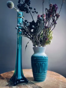 Szukasz zestawu, który subtelnie przyciągnie uwagę i wprowadzi do wnętrza odrobinę artystycznego spokoju? „Pięknie różni” to harmonijny duet, który łączy dwa światy – szklane rzeźbiarskie wzornictwo z ceramiką o surowym, a zarazem dekoracyjnym charakterze. Te dwa wazy – jedna smukła, szklana, o geometrycznej podstawie, druga ceramiczna, matowo-błyszcząca z ręcznie dekorowanym szkliwieniem – są jak przeciwieństwa, które się przyciągają.