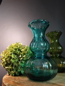 Wazon turkusowy – o głębokiej, szmaragdowej barwie i dekoracyjnie wyprofilowanym brzuścu. Zachwyca grą światła i subtelnym połyskiem szkła.