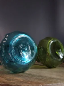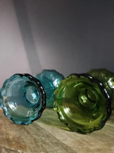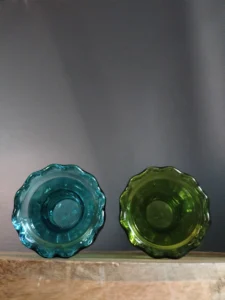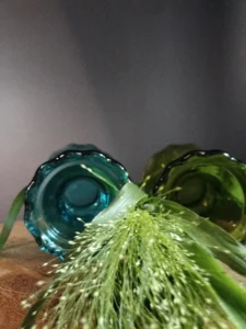 Wazony retro zestaw „Twins”– dwa brzuchate wazony z grubego szkła (prawdopodobnie lata 50-te XX w) odbijającego pięknie świetlne refleksy. W kolorze naturalnej, spokojnej zieleni i jasnego turkusu. Klasyczny wzór wazonu na kwiaty z falbanką na górnej krawędzi, piękne, stonowane kolory, a jednocześnie błysk szkła sprawiają ze ten zestaw przywołuje obrazy lata, słońca, łąki i pięknych chwil. Doskonały na prezent dla ceniących klasykę, naturę i urok szkła vintage.
