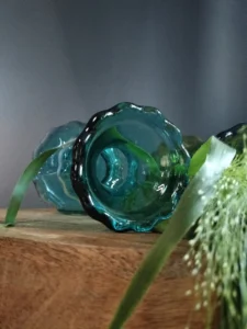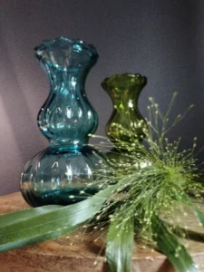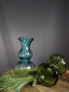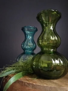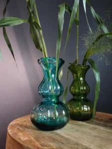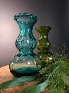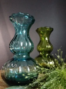 Zestaw dwóch wazonów z barwionego szkła to prawdziwa perełka dla miłośników przedmiotów z duszą. Ich delikatna, pękata forma i intensywne kolory – turkusowy i oliwkowo-zielony – tworzą harmonijną, a zarazem wyrazistą parę, która przyciąga wzrok. To dekoracja, która nie potrzebuje kwiatów, by błyszczeć.
