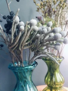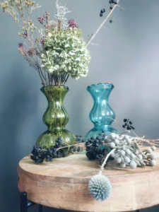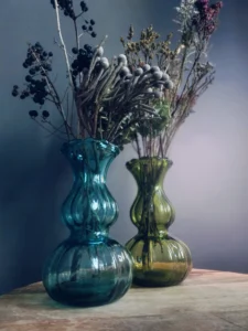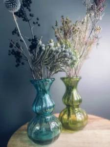 Oba wazoniki wykonano z dmuchanego szkła, z widocznymi pęcherzykami powietrza, które podkreślają ich rękodzielniczy charakter. Doskonałe do dekoracji stołu, komody lub półki – także bez bukietu.