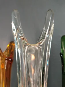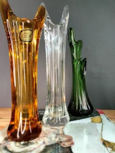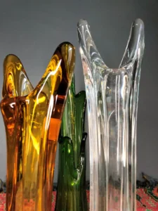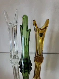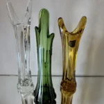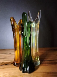 Każdy z tych trzech egzemplarzy to niepowtarzalny przykład szkła artystycznego: osobny, a jednocześnie idealnie współgrający z pozostałymi w kompozycji.