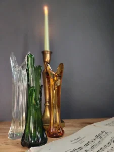 Trzy wazy. Trzy charaktery. Trzy pionowe manifesty kunsztu ręcznego formowania szkła. Każdy z nich wyciągnięty ku górze jak szklana wieża – z bursztynową siłą, szmaragdową falą i przejrzystością kryształu. Zestaw „Trzy Wieże” to hołd dla formy, który wprowadza architektoniczny porządek do przestrzeni – bez potrzeby użycia słów.