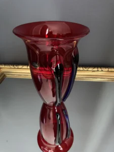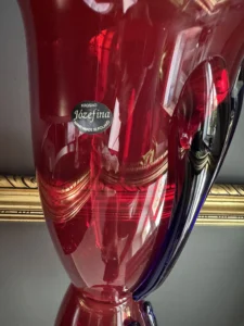 To ręcznie formowany wazon kolekcjonerski z legendarnej huty Józefina (oddział Huty Krosno), wytworzony prawdopodobnie w latach 1990–2000. Jego wyjątkowa konstrukcja bazuje na klasycznym kształcie kielichowym, wzbogaconym o przytopione aplikacje z czarnego i granatowego szkła – dynamicznie wijące się po bokach, nadające formie plastyczny rytm i kontrast.