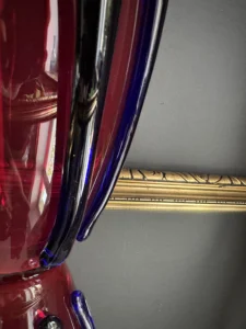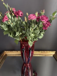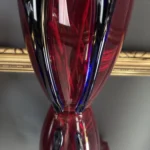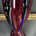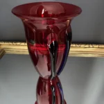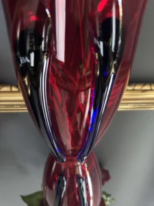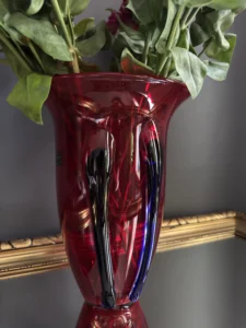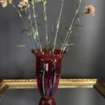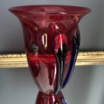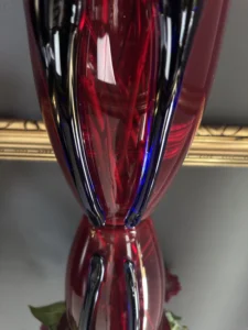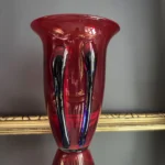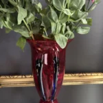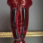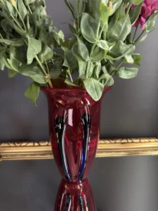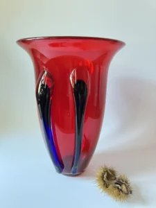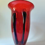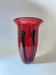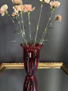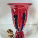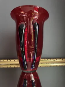 Głęboka, krwista czerwień w połączeniu z ciemnymi żebrowaniami sprawia, że wazon działa niczym rzeźba świetlna – intensywnie odbija światło, podkreślając strukturę szkła. Doskonale odnajdzie się zarówno w eklektycznych, jak i nowoczesnych wnętrzach – jako pojedynczy akcent lub część kolekcji art glass z hut polskich.