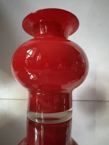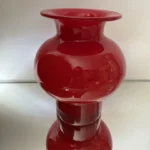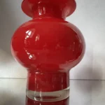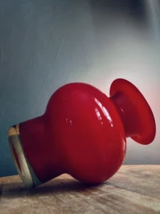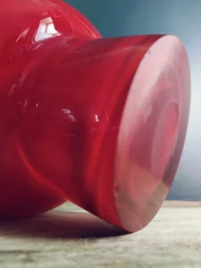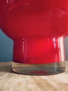 Wazon „Energia czerwieni” to wyrazisty przykład polskiego szkła artystycznego z lat 70. – solidny, z masywnym dnem i soczystą barwą, która przyciąga wzrok z każdej strony. To nie tylko naczynie dekoracyjne, ale też emocja zamknięta w szkle – intensywna, zmysłowa, nie do przeoczenia.