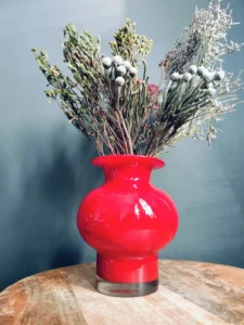Szklany wazon w intensywnie czerwonym kolorze to doskonały wybór dla miłośników designu, którzy cenią niepowtarzalność i ponadczasowe wzornictwo. Grube, ręcznie formowane szkło o mleczno-klarownej strukturze tworzy efekt trójwymiarowej głębi. Zjawiskowo prezentuje się solo, a także z minimalistycznymi suszonymi roślinami, świeżymi gałązkami eukaliptusa czy kontrastowymi kwiatami.
