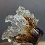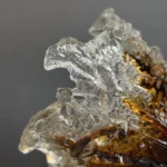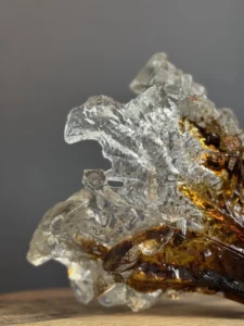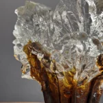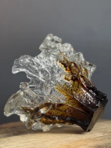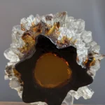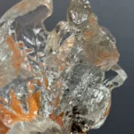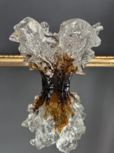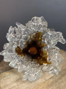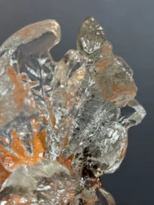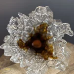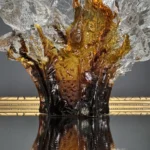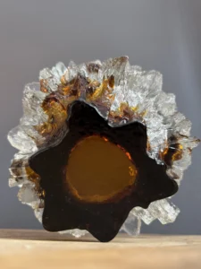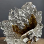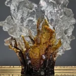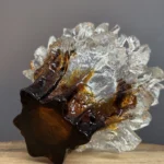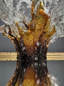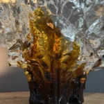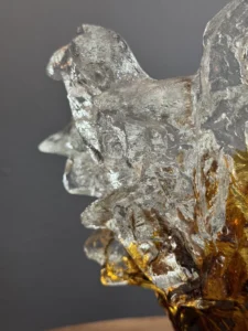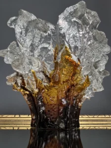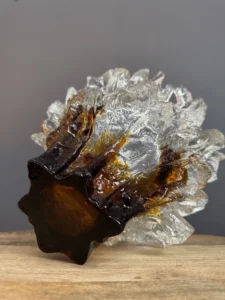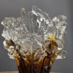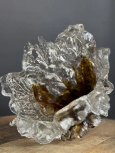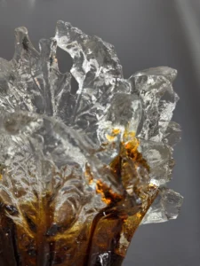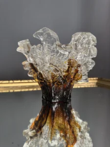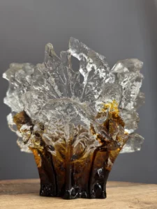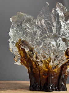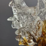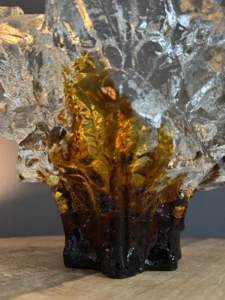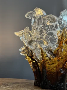 Ten unikatowy wazon artystyczny, to spektakularny przykład szklarskiego rzemiosła w stylu freeform i chunk glass. Wykonany ręcznie z grubego, nieregularnie topionego szkła, łączy w sobie przezroczyste lodowe struktury z intensywnie bursztynowym wnętrzem. W jego fakturze można dostrzec zarówno siłę ognia, jak i chłód lodu – niczym natura zamknięta w ruchu.