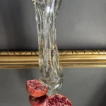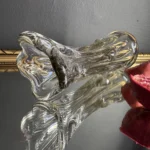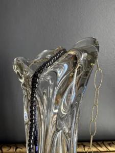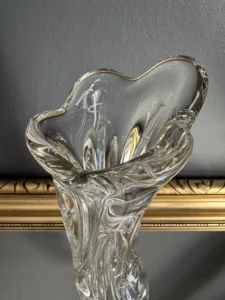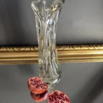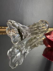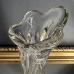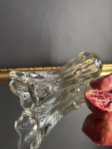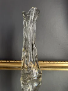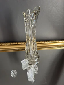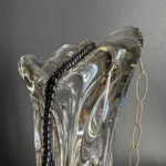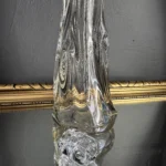 Wykonany z grubego szkła o krystalicznej czystości, wazon zachwyca organiczną linią i dynamiczną formą. Delikatne smugi i załamania wewnątrz struktury przypominają ruch wody – dzięki temu rzeźba staje się żywym elementem wnętrza.