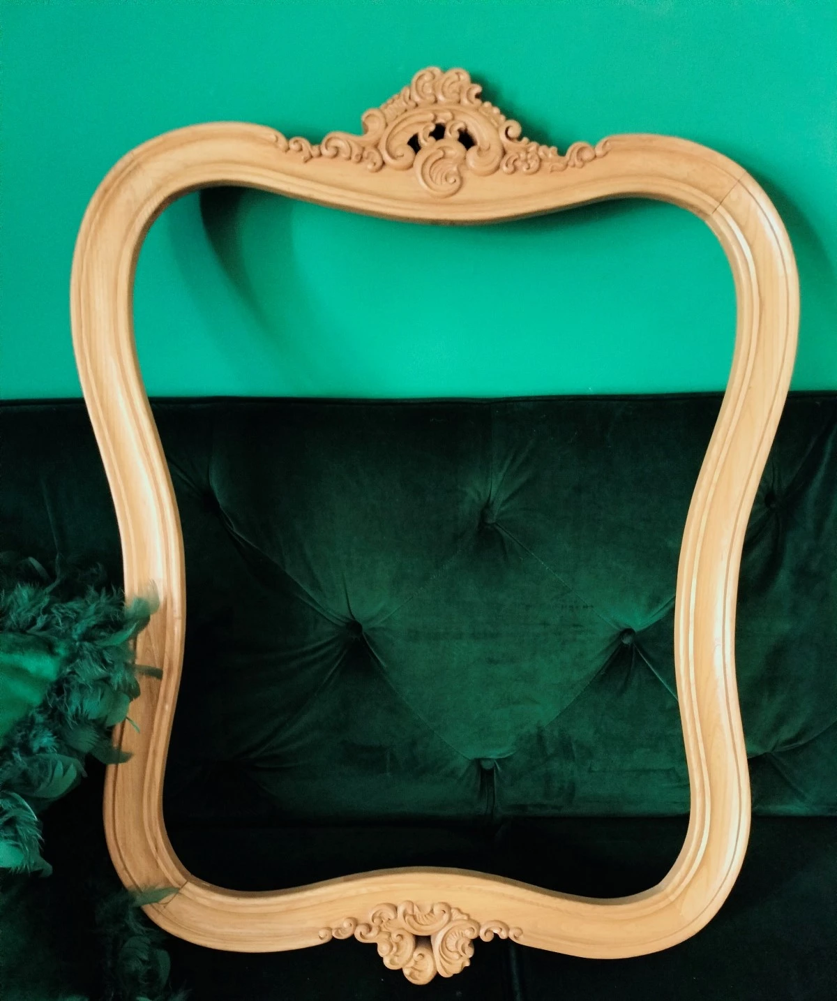 Original in shape and form frame in light wood color, semi-matte lacquer. Folded in parts (into wedges) with ornaments on the top and bottom. Can be styled according to. The client’s idea, after the arrangement of details and an additional fee.