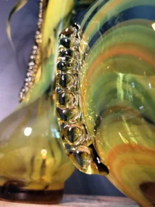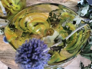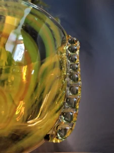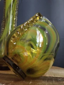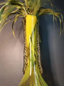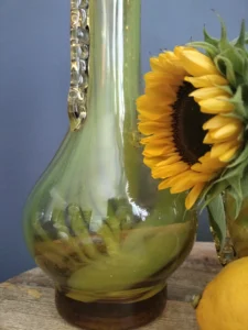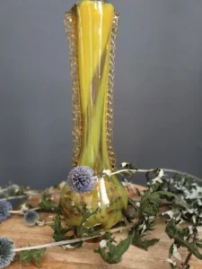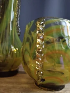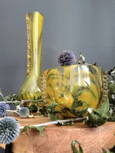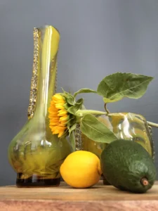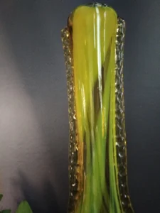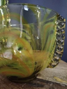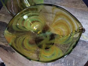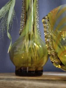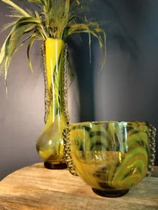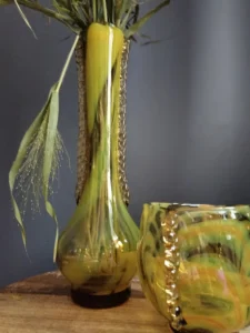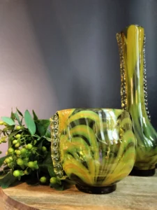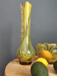 „Yellow half-shades ” – unique because of its intense yellow color, a set of art glass from the Laura Glassworks in Tarnow, 1970s. Included is a very tall vase of hand-molded, tinted, semi-transparent glass in honey color with yellow (as opposed to the popular orange) streaks. The form is slender, pulled, with decorative overlays on both sides. It comes with a deep bowl of yellow-orange streaks, with the same origin, and makes a unique set. It is important to note that each Laura Steelworks vase that survives today is different, the dimensions and coloring are not strictly the same. Very good condition. Flacon: height – 43 cm, base diameter – 9 cm, filler diameter – 7×6 cm Bowl: filler diameter – 17×13, base diameter – 8 cm