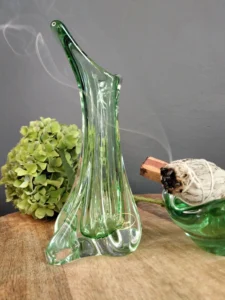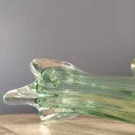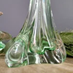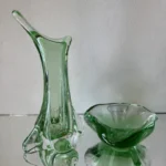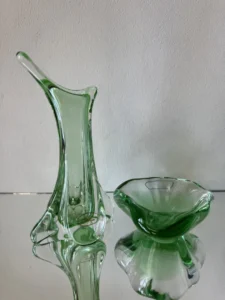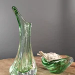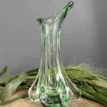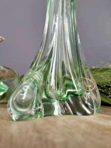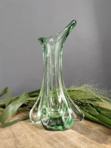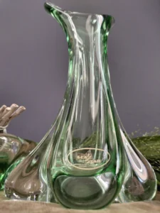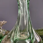 Smukły wazon z falującą linią – o organicznej, opływowej formie i subtelnym przejściu od transparentnej zieleni po kryształową podstawę. Zachwyca światłocieniem i efektami refrakcji. Prawdopodobnie z lat 50./ 60. XX w. z Bohemia Glass Star szkło Czeskie (z naklejką firmową).