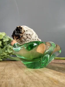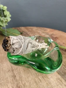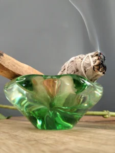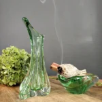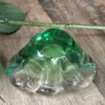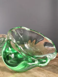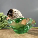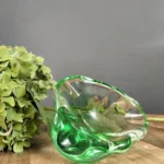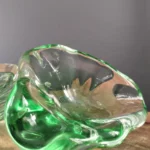 Asymetryczna misa/ popielnica art glass – o podobnym pochodzeniu, o płynnej, rozlewającej się strukturze. Idealna jako kadzielniczka, puzderko na biżuterię, lub po prostu rzeźbiarski akcent w salonie.