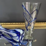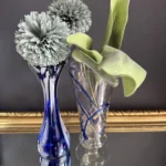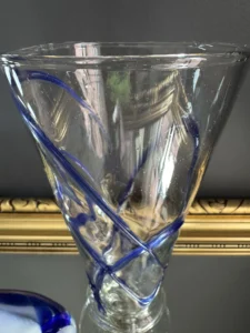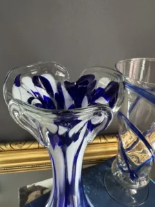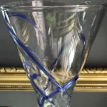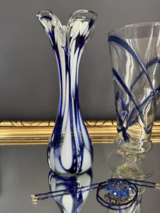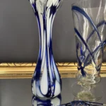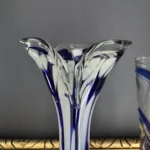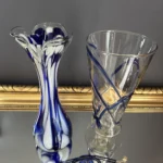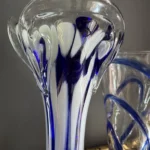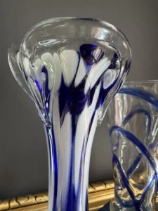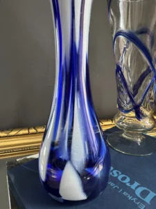 Wazon smukły z białymi smugami ze szkła dmuchanego, ręcznie formowanego wystrzyganego tzw. rwaniec. Projekt powielany w wielu polskich czy czeskich hutach. Ten pochodzi z Huty Szkła Gospodarczego Ząbkowice ( katalog produktów Katalog Ząbkowice ), z lat 60. – 70. XX w. Wazon z zatopionymi nitkami kobaltu, to również polski produkt, pochodzi z lat 80.-90. XX w.