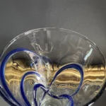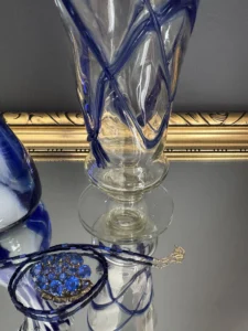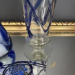 Dwa ręcznie formowane wazony ze szkła artystycznego z lat 70. zachwycają kontrastem głębokiego kobaltu i przezroczystości. Wysokie, smukłe formy z zatopionym wzorem sprawiają, że światło przepływa przez nie jak przez warstwy lodu i atramentu. Szklane linie tworzą hipnotyczne kompozycje, idealne do wnętrz z duszą.