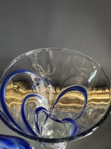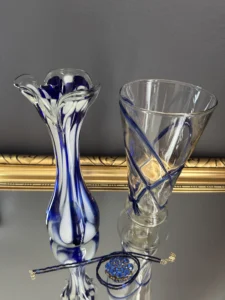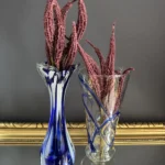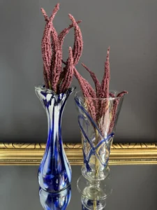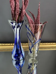 Pierwszy wazon ma rozkloszowaną górę i formę z efektem skręcania spiralnego – pełen ruchu i światłocienia. Drugi, bardziej prosty w formie, zdobią zatopione pasma w kolorze kobaltu i granatu, wijące się wokół przejrzystego korpusu. Oba tworzą niezwykły duet – do ekspozycji razem lub osobno.