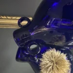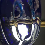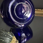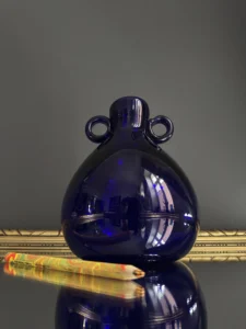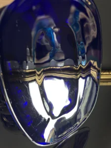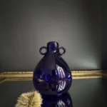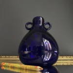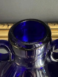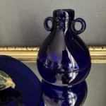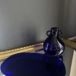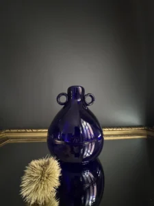 Zestaw wykonany z intensywnie barwionego, kobaltowego szkła przyciąga wzrok głębokim odcieniem granatu i harmonijną formą. Składa się z rzeźbiarskiego dzbanka z dwoma uchwytami oraz patery o organicznym kształcie. Całość emanuje elegancją charakterystyczną dla szkła artystycznego drugiej połowy XX wieku.