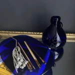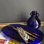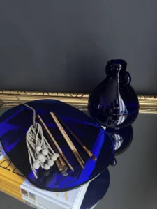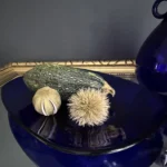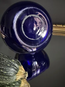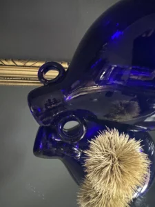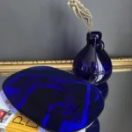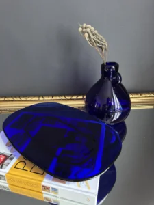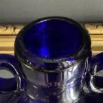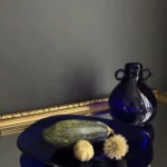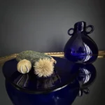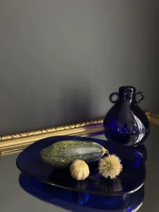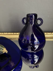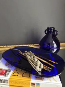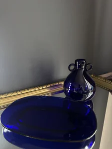Ten zestaw to przykład ręcznie formowanego szkła użytkowego. Dzban może być wykonany w jednej z polskich hut szkła w latach 60.–80. XX w., takich jak Huta Szkła Ząbkowice lub Barbara w Polanicy-Zdroju. Kobaltowe szkło było w tym czasie synonimem luksusu i nowoczesności – zarówno w dekoracjach wnętrz, jak i użytkowych kolekcjach stołowych. Prezentowana patera kobaltowa została wykonana we Włoszech w Bormioli Rocco (to renomowana włoska huta szkła, założona w 1825 roku w Parmie. Marka słynie z eleganckiego, użytkowego szkła i wysokiej jakości wyrobów), prawdopodobnie w latach 80. lub 90. XX wieku, kiedy to produkty ze szkła barwionego na kobaltowo cieszyły się dużą popularnością, szczególnie w aranżacjach nowoczesnych i minimalistycznych. Patera z wyraźnym połyskiem szkła formowanego maszynowo.