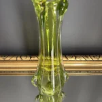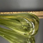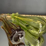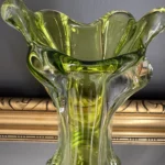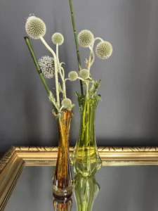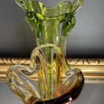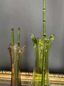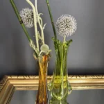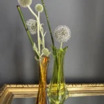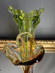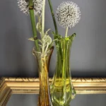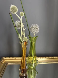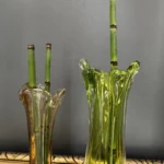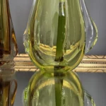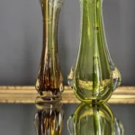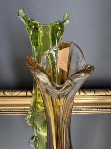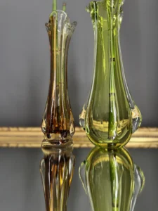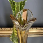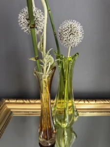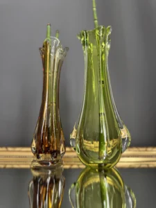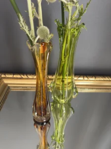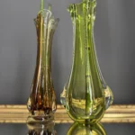Wyjątkowy duet wazonów z ręcznie formowanego szkła artystycznego w tonacji świeżej zieleni i bursztynowej miedzi. Te vintage perełki nie tylko pięknie eksponują kwiaty, ale także same w sobie są rzeźbiarskimi obiektami dekoracyjnymi. Subtelnie załamują światło, wprowadzając do wnętrza miękkie refleksy i naturalną elegancję.