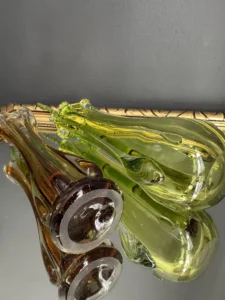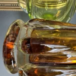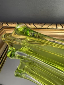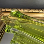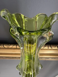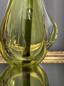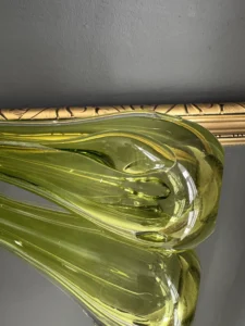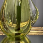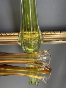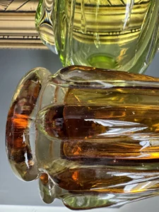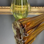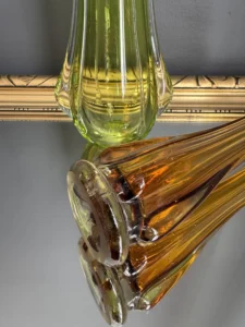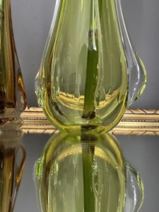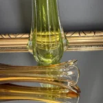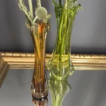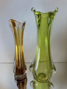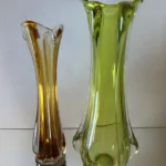 Wazon zieleń w odcieniu limonki pochodzi ze z znanej i cenionej huty szkła Val Saint Lambert Belgium z lat 50./60. XX w., natomiast wazon bursztynowy to szkło norweskie z podobnego czasu.
