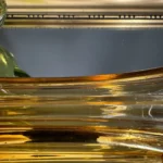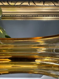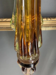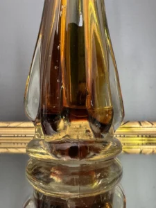 Ręczne wykonanie – szkło artystyczne z wyraźnym śladem pracy hutnika, na wazonie bursztynowym zatopione pęcherzyki powietrza, które dodają światła i uroku vintage