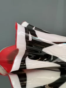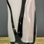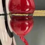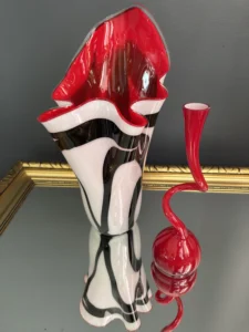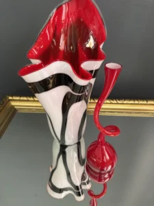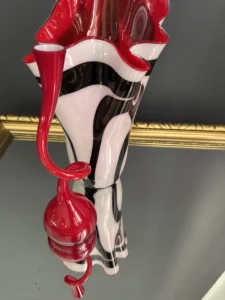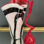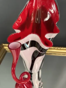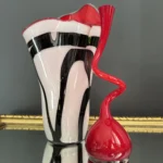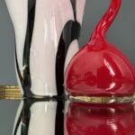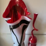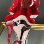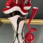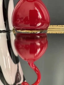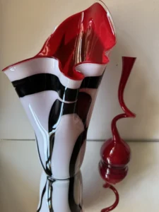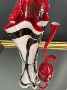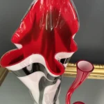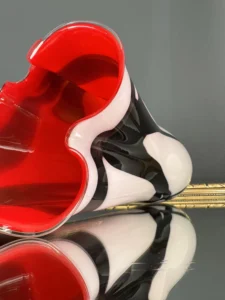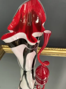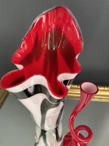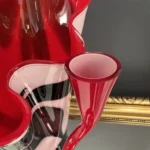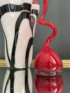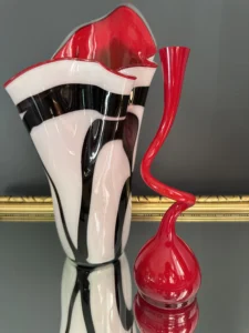 Ten niepowtarzalny zestaw stanowi mariaż włoskiej i skandynawskiej sztuki szkła. Wazon typu zebra z dynamicznym układem bieli, czerni i czerwieni to przykład nowoczesnego rzemiosła inspirowanego stylem Murano – z płynną, falującą krawędzią i perfekcyjnym wykończeniem.