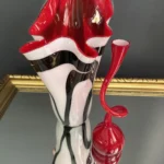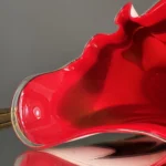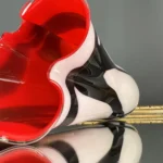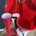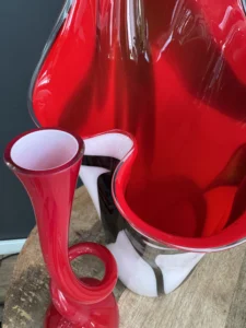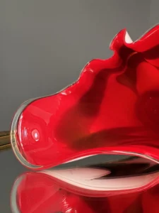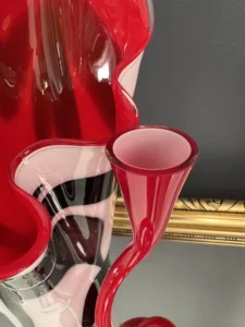Czerwone szkło duńskie w zgeometryzowanej formie bywało również prezentowane w latach 80. w galeriach designu użytkowego, łącząc funkcjonalność z rzeźbiarską ekspresją.
