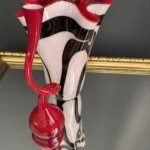 Drugi element zestawu to rzeźbiarska forma ze szkła duńskiego w intensywnie czerwonym odcieniu – o spiralnym, zakręconym kształcie przypominającym nowoczesne formy secesyjne. To nie tylko dekoracja, ale i manifest designu.