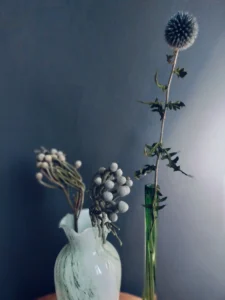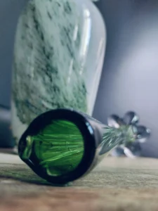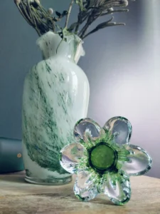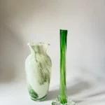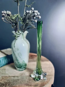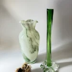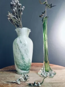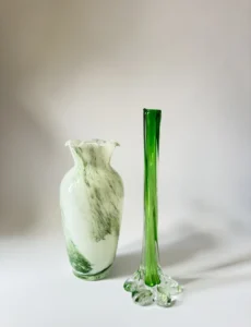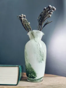 Zestaw „Murano w pistacji” to ukłon w stronę subtelnych emocji zaklętych w szkle. Łączy delikatność mlecznobiałego szkła z zielonym akcentem wazonu typu murano oraz organiczną formą ręcznie formowanego flakonu ze stopką przypominającą płatki kwiatów. Oba obiekty tworzą niepowtarzalny duet – wyciszony, a zarazem wyrazisty. Ten zestaw nie tylko ozdobi wnętrze, ale stanie się punktem zaczepienia dla tych, którzy kochają sztukę użytkową z duszą.