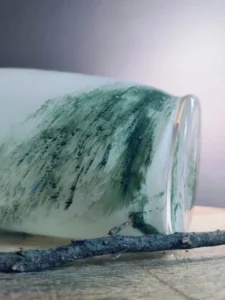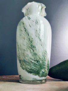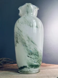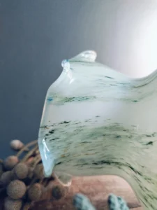 Ręcznie wykonany, z mlecznobiałego szkła o organicznych, zielonych smugach przypominających mchy lub akwarelowe pejzaże. Delikatna, nieregularna krawędź nadaje mu rzeźbiarskiego charakteru.. O klasycznej formie, piękny w kształcie i strukturze przypominającej szlifowany marmur. Mory w odcieniu ciemnej zieleni mają gdzieniegdzie wplecione niebieskie i złote żyłki. To charakterystyczne dla oryginalnego szkła tworzonego przez rzemieślników Murano, że ma bogate kolory i często prawdziwe złote lub srebrne plamki w środku.Szklany flakon w kształcie kwiatowej łodygi