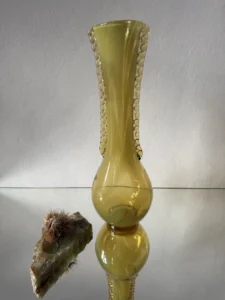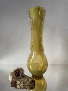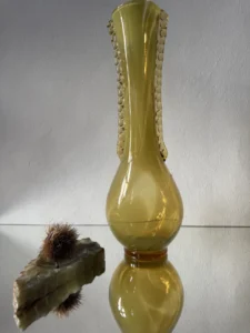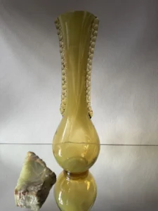 Szklany wazon vintage – Utrzymany w słonecznych tonach cytryny i karmelu, ręcznie wykonany, o eleganckiej, smukłej formie z dekoracyjnym ornamentem bąbelkowym po bokach. Jego szkło delikatnie przechodzi od mlecznej mgiełki do transparentnych akcentów bursztynowych. Ciepły i pełen światła. Wysoki wazon z Huty Szkła Laura w Tarnowie, lata 70-te XX w., szkło artystyczne, ręcznie formowane, barwione, półprzeźroczyste.