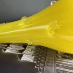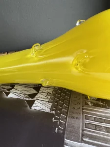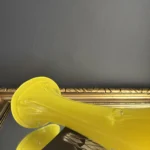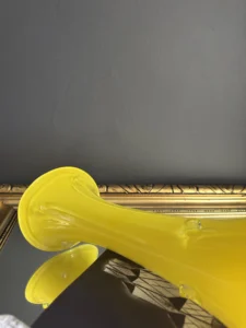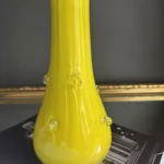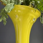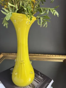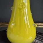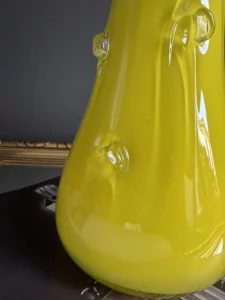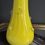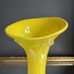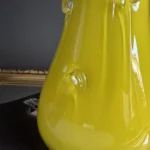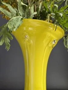 Intensywnie żółty wazon to prawdziwa rzeźba użytkowa – unikatowy przedmiot kolekcjonerski wykonany ręcznie w technice sękacza, popularnej w hutach szkła w Europie Środkowej w drugiej połowie XX wieku.